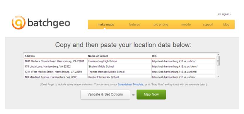 BatchGeo is a resource I was exposed to at the VSTE conference in December and was immediately excited about. This website allows you to map data from a spreadsheet, website, or other source by just copying and pasting. First, copy data like addresses, cities, gps coordinates, and other important data from a spreadsheet, webpage, document, or table. Then paste it into the data box on the website. Finally, click the green Map It button and you're done!